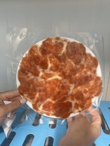 También se podría vender en bloque para formatos HORECA, hemos conseguido que el veteado de grasa se mantenga blanca (el sinjamón se acababa tiñendo rosa por la remolacha)