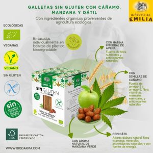 Galletas sin gluten de cáñamo, manzana y dátil, sin azúcares añadidos y lactosa, elaboradas con dátil y aceite de oliva virgen extra de alta calidad. Ecológicas y veganas, cuentan con la aprobación de la Federación de Asociaciones de Celíacos de España. Gracias al dátil tienen un alto contenido en fibra y dulzor natural y, gracias a las semillas de cáñamo, son ricas en ácidos grasos omega-3 y omega-6. Se trata de un producto nutritivo y saludable empaquetado en plástico biodegradable.